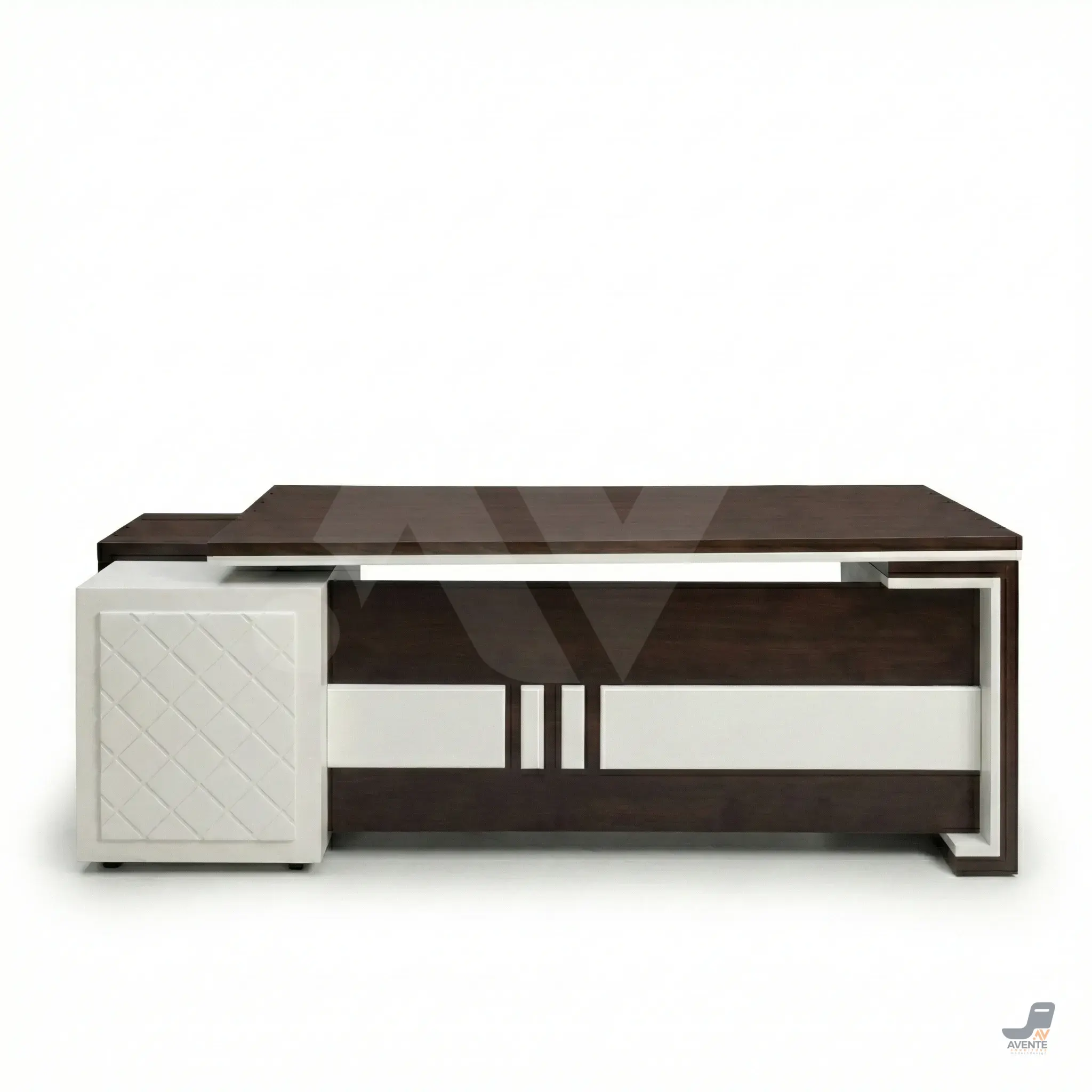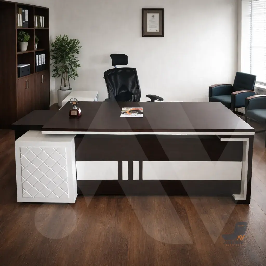 مكتب إدارة عليا بتصميم مودرن عملي، مصنوع من خشب MDF إسباني عالي الجودة، بقشرة صناعي مقاومة للخدش وسهلة التنظيف. يشمل وحدة جانبية (سايد) تحتوي على أدراج وضلف للتخزين، مع إمكانية تنفيذ المكتب بأي لون حسب الطلب.( اطلب كارتلة الألوان )